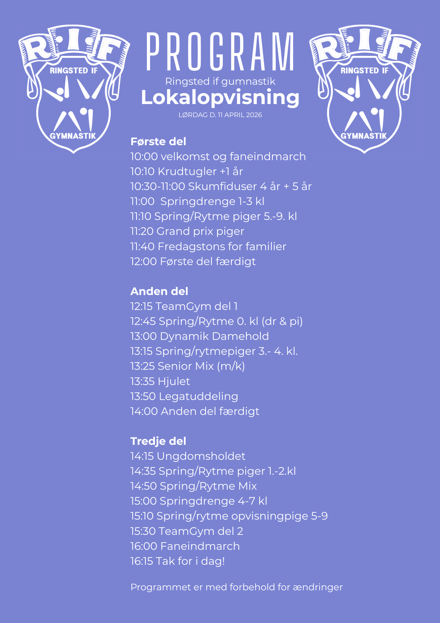 Denne sæsons lokalopvisning løber af stablen lørdag den 11. april 2026 i tidsrummet 9.30 -17.00 (foreløbigt).